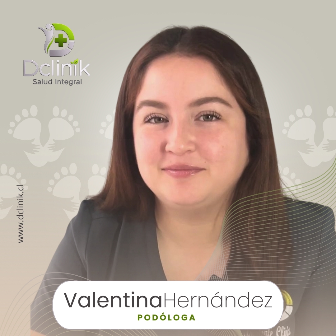 En DClinik, la atención podológica está a cargo de la Podóloga Valentina Hernández, quien entrega una atención profesional, cuidadosa y personalizada, adaptada a las necesidades de cada paciente.